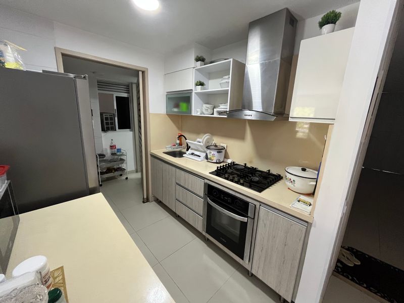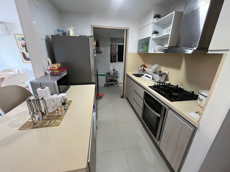 La moderna cocina integral, de formato abierto y con barra estilo americano, se integra armónicamente con la zona social. Viene completamente equipada con instalación de gas y cuenta con acabados de alta calidad que facilitan su mantenimiento diario. Adicionalmente, dispone de una zona de lavandería totalmente independiente y ventilada, junto con una práctica alcoba y baño de servicio.